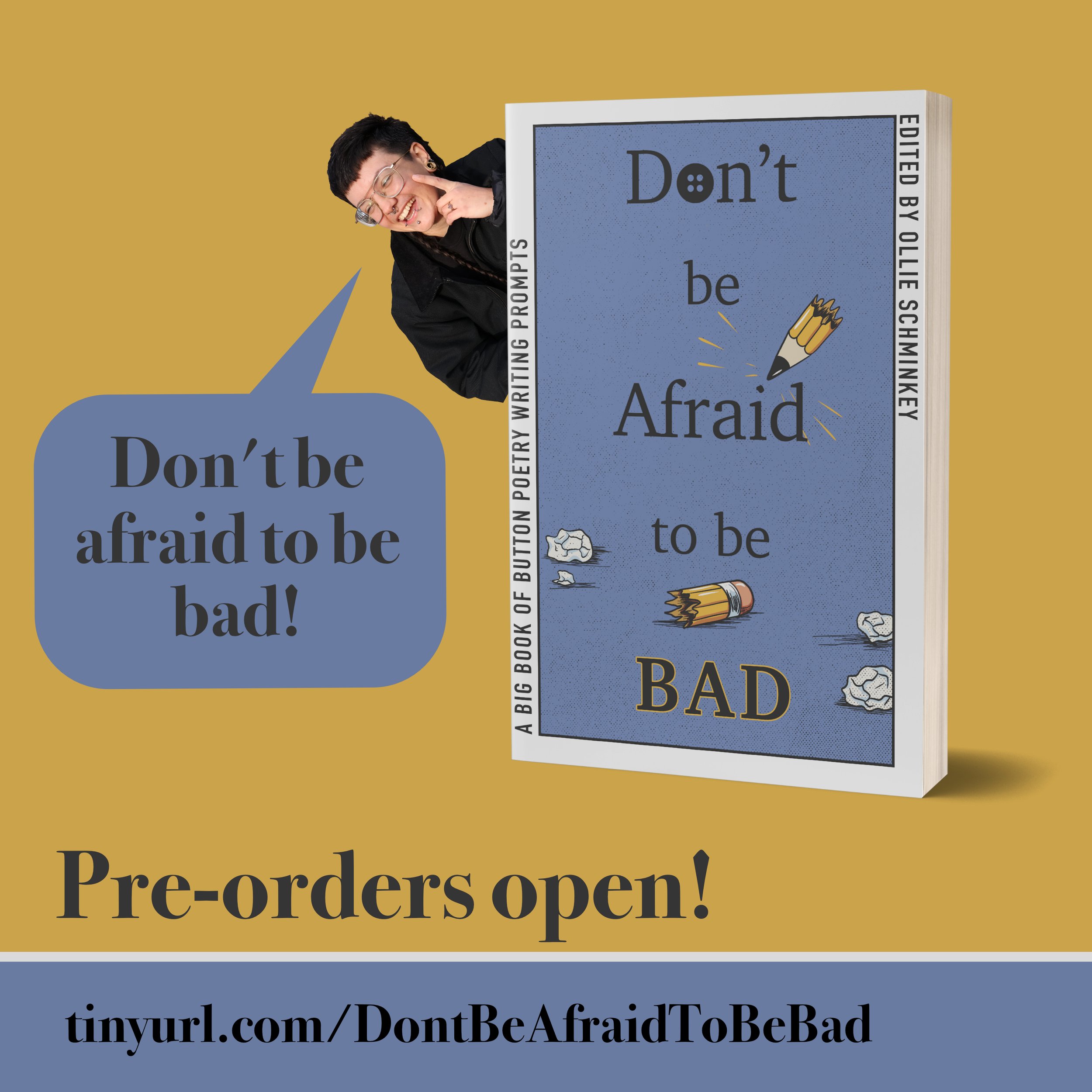 Speaking of that book, Don’t Be Afraid to Be Bad is open for pre-orders! This book includes a poem from almost every Button Poetry author reprinted, followed by a prompt inspired by that poem (yes, that means I’ve read the entire Button catalog). It would mean a lot to me if you pre-ordered it, and I hope you have a lot of fun writing alongside it!