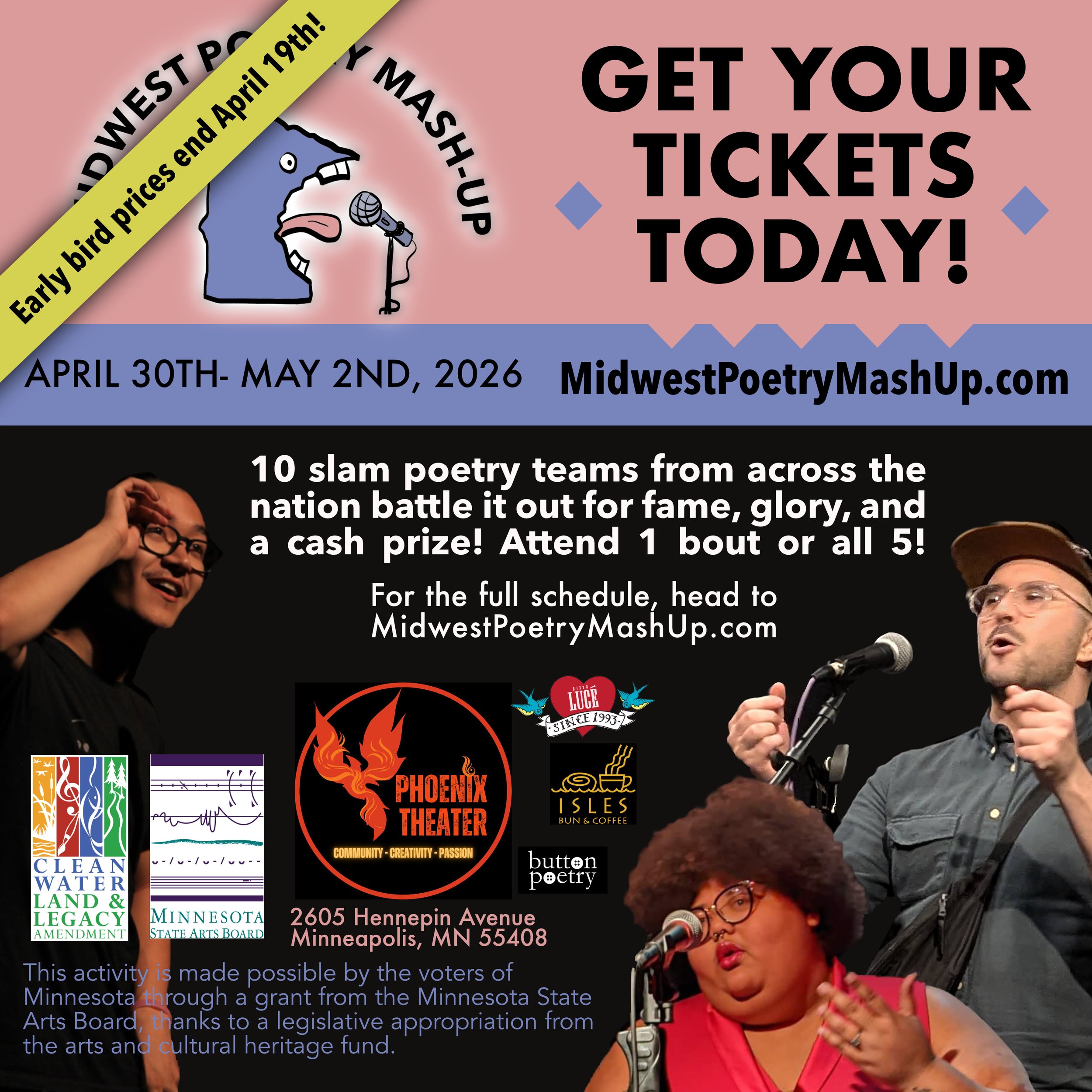 Tickets are officially on sale for my favorite thing of the year! Until April 19th, you can get a single bout ticket for $8, finals for $15, or a whole festival pass for only $25 (that’s FIVE shows). If you’re in Minnesota, I really hope to see you there! (You’ll see some of the best slam poetry of your life, plus if you want to, you can be a judge!)