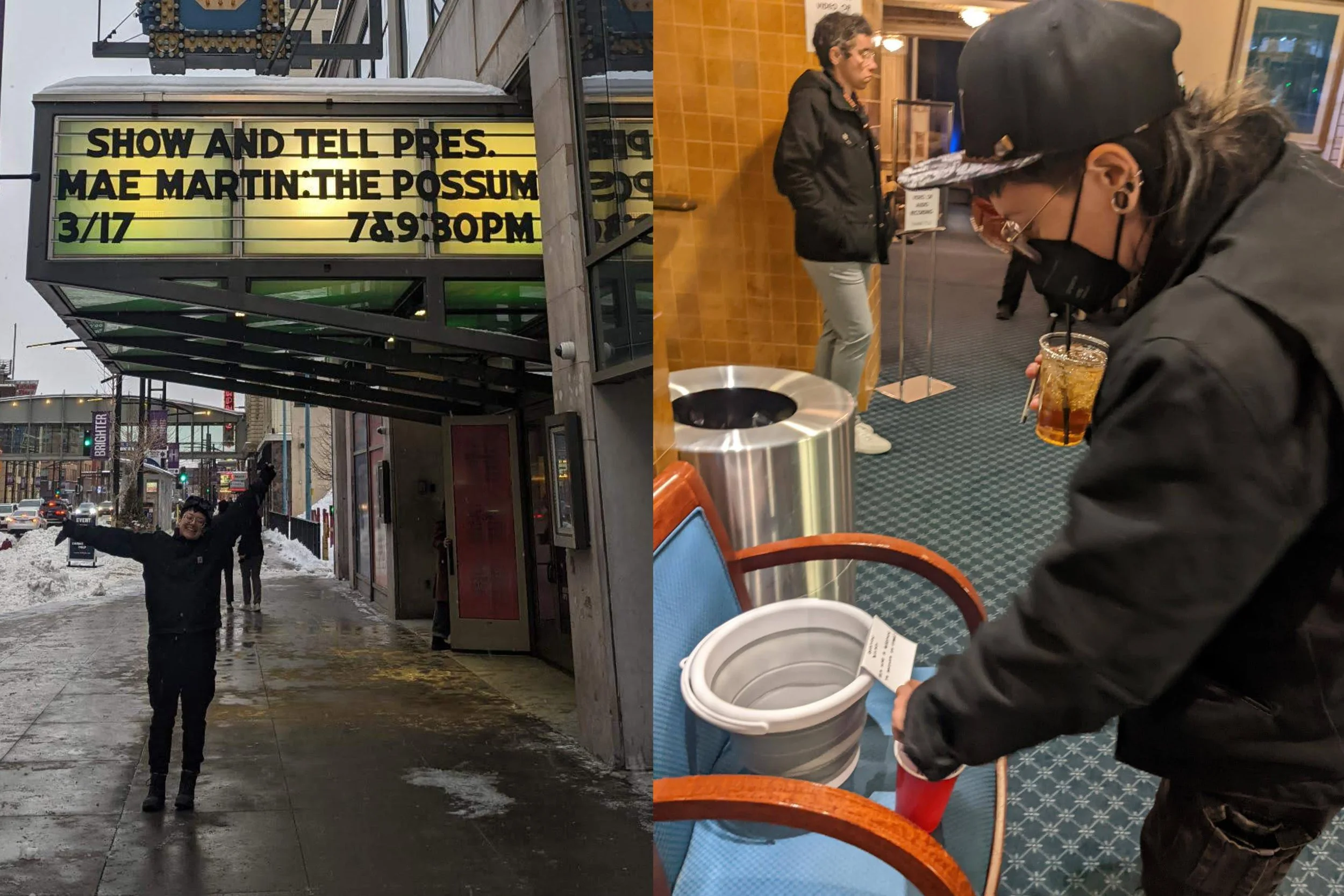 My partner got me tickets to see Mae Martin for my birthday, and pictured here you can see me putting entirely too many questions into the question bucket in an attempt to stack the odds in my favor. Unfortunately, Mae did not end up randomly choosing any of my questions, which was a real shame because they included such gems as “Would you rather bang Paul Bunyan or Babe the Big Blue Ox?” and “Don’t you think Minnesotan accents are, like, at least a little hot?”